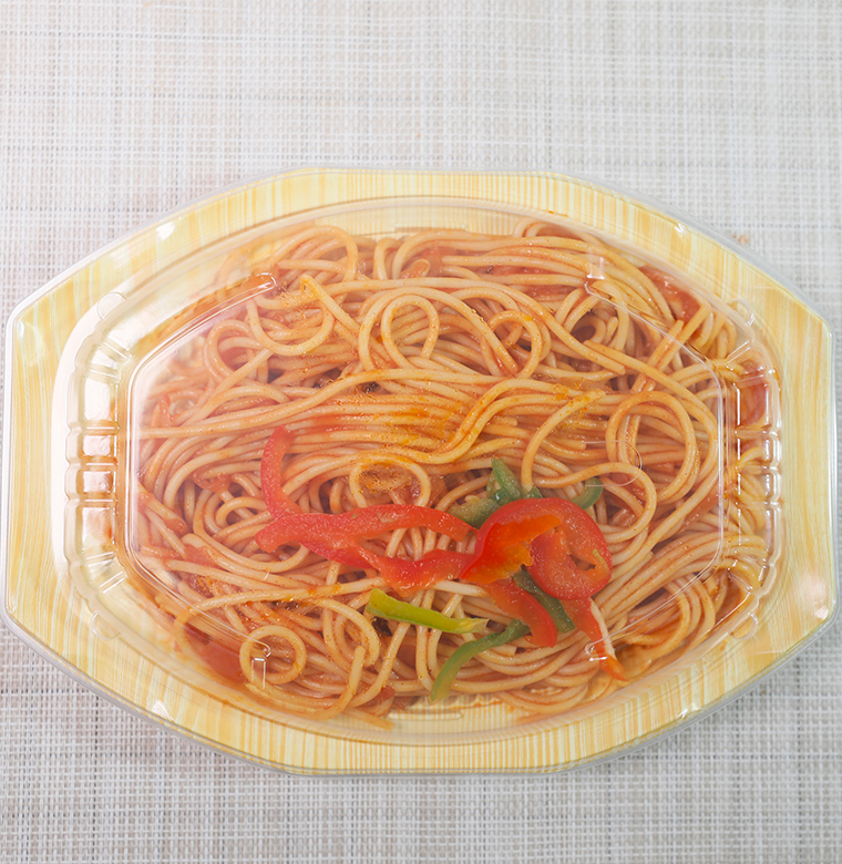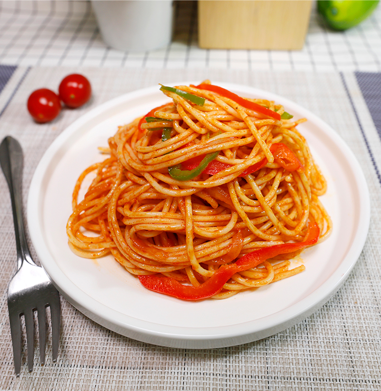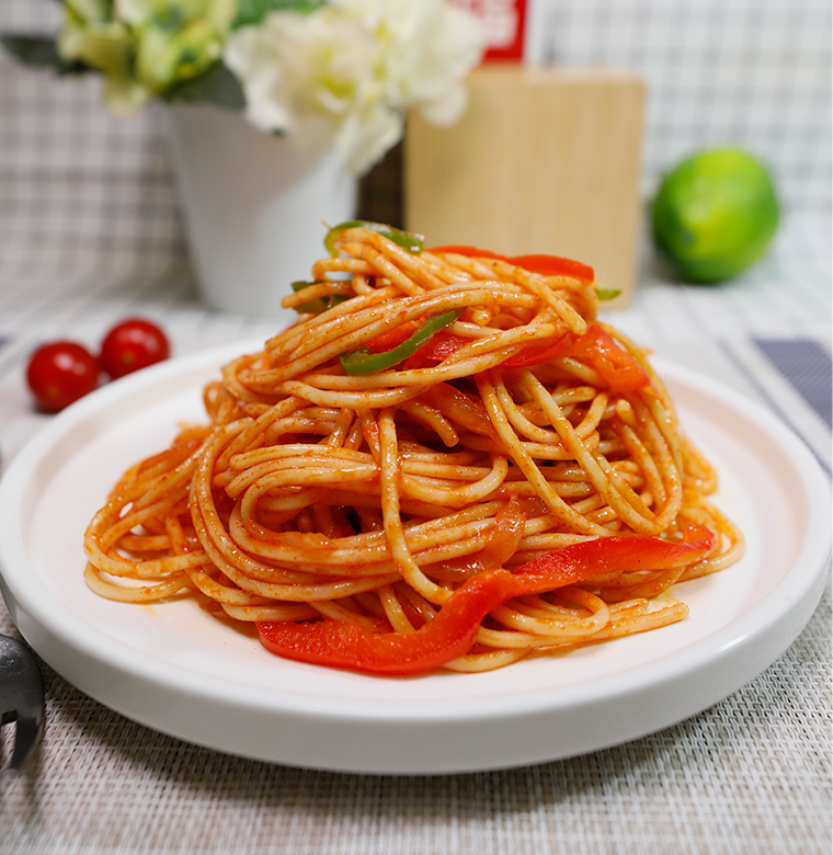 意大利面、洋蔥、番茄沙司、意大利比薩醬、紅彩椒、綠彩椒